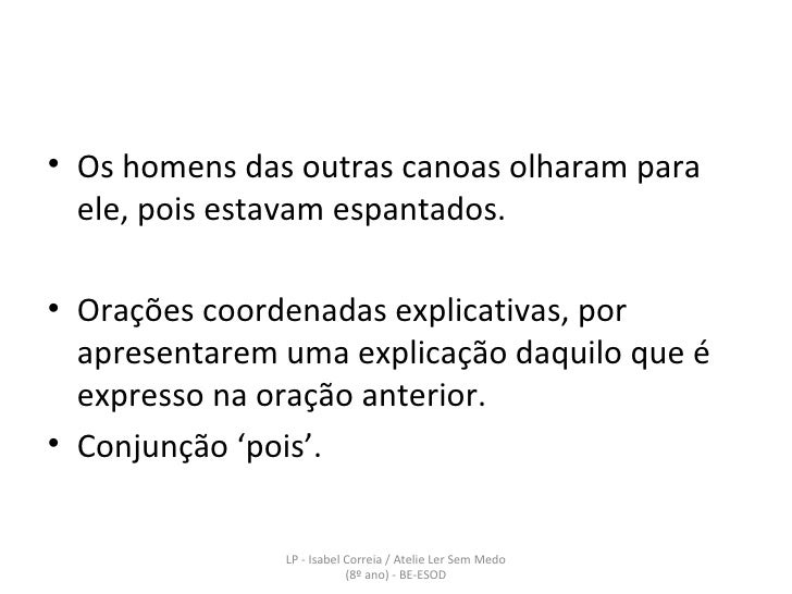 20. 20. <ul><li>Os homens das outras canoas olharam para ele, pois estavam espantados. </li></ul><ul><li>Orações coordenadas explicativas, por apresentarem uma explicação daquilo que é expresso na oração anterior. </li></ul><ul><li>Conjunção ‘pois’. </li></ul>LP - Isabel Correia / Atelie Ler Sem Medo (8º ano) - BE-ESOD