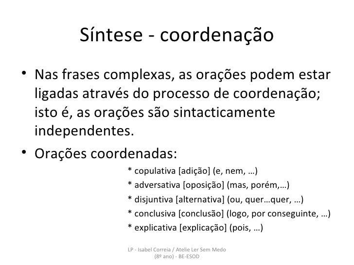 21. 21. Síntese - coordenação <ul><li>Nas frases complexas, as orações podem estar ligadas através do processo de coordenação; isto é, as orações são sintacticamente independentes. </li></ul><ul><li>Orações coordenadas: </li></ul><ul><ul><ul><ul><ul><li>* copulativa [adição] (e, nem, …) </li></ul></ul></ul></ul></ul><ul><ul><ul><ul><ul><li>* adversativa [oposição] (mas, porém,…) </li></ul></ul></ul></ul></ul><ul><ul><ul><ul><ul><li>* disjuntiva [alternativa] (ou, quer…quer, …) </li></ul></ul></ul></ul></ul><ul><ul><ul><ul><ul><li>* conclusiva [conclusão] (logo, por conseguinte, …) </li></ul></ul></ul></ul></ul><ul><ul><ul><ul><ul><li>* explicativa [explicação] (pois, …) </li></ul></ul></ul></ul></ul>LP - Isabel Correia / Atelie Ler Sem Medo (8º ano) - BE-ESOD