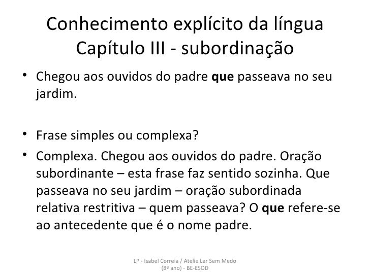 22. 22. Conhecimento explícito da língua Capítulo III - subordinação <ul><li>Chegou aos ouvidos do padre que passeava no seu jardim. </li></ul><ul><li>Frase simples ou complexa? </li></ul><ul><li>Complexa. Chegou aos ouvidos do padre. Oração subordinante – esta frase faz sentido sozinha. Que passeava no seu jardim – oração subordinada relativa restritiva – quem passeava? O que refere-se ao antecedente que é o nome padre. </li></ul>LP - Isabel Correia / Atelie Ler Sem Medo (8º ano) - BE-ESOD