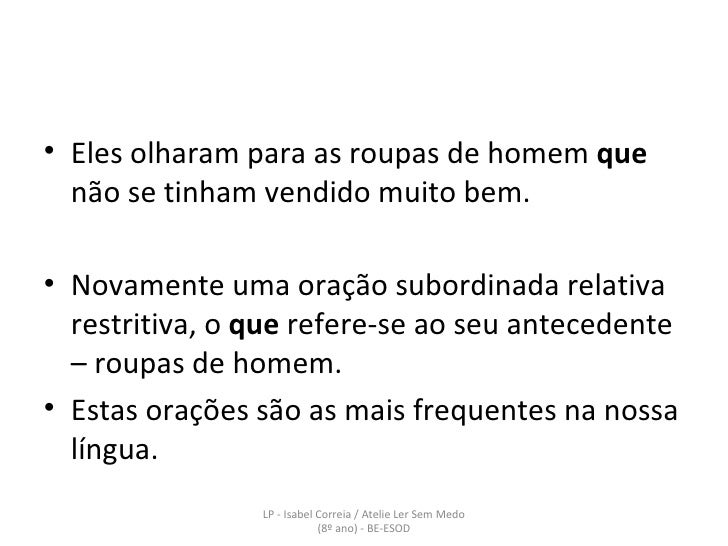 23. 23. <ul><li>Eles olharam para as roupas de homem que não se tinham vendido muito bem. </li></ul><ul><li>Novamente uma oração subordinada relativa restritiva, o que refere-se ao seu antecedente – roupas de homem. </li></ul><ul><li>Estas orações são as mais frequentes na nossa língua. </li></ul>LP - Isabel Correia / Atelie Ler Sem Medo (8º ano) - BE-ESOD