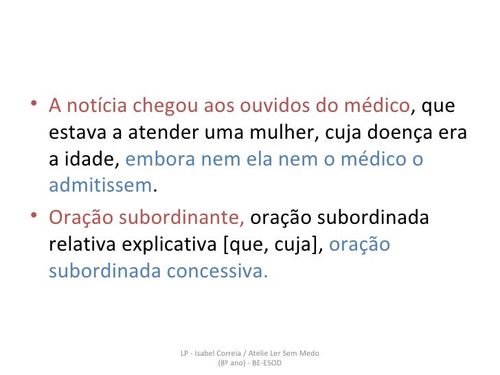 24. 24. <ul><li>A notícia chegou aos ouvidos do médico , que estava a atender uma mulher, cuja doença era a idade, embora nem ela nem o médico o admitissem . </li></ul><ul><li>Oração subordinante, oração subordinada relativa explicativa [que, cuja], oração subordinada concessiva. </li></ul>LP - Isabel Correia / Atelie Ler Sem Medo (8º ano) - BE-ESOD