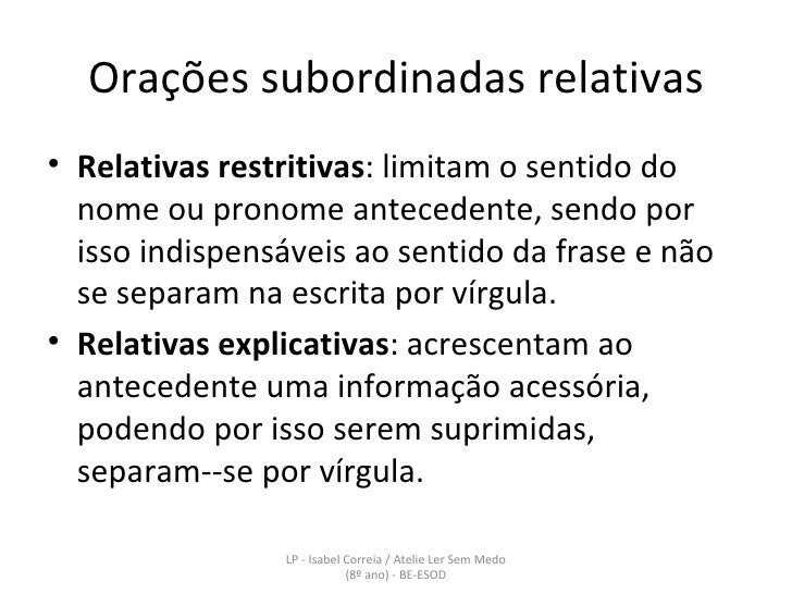 25. 25. Orações subordinadas relativas <ul><li>Relativas restritivas : limitam o sentido do nome ou pronome antecedente, sendo por isso indispensáveis ao sentido da frase e não se separam na escrita por vírgula. </li></ul><ul><li>Relativas explicativas : acrescentam ao antecedente uma informação acessória, podendo por isso serem suprimidas, separam--se por vírgula. </li></ul>LP - Isabel Correia / Atelie Ler Sem Medo (8º ano) - BE-ESOD
