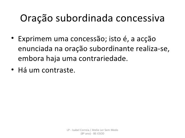 26. 26. Oração subordinada concessiva <ul><li>Exprimem uma concessão; isto é, a acção enunciada na oração subordinante realiza-se, embora haja uma contrariedade. </li></ul><ul><li>Há um contraste. </li></ul>LP - Isabel Correia / Atelie Ler Sem Medo (8º ano) - BE-ESOD