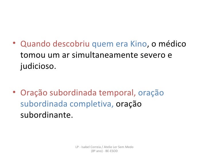 27. 27. <ul><li>Quando descobriu quem era Kino , o médico tomou um ar simultaneamente severo e judicioso. </li></ul><ul><li>Oração subordinada temporal, oração subordinada completiva, oração subordinante. </li></ul>LP - Isabel Correia / Atelie Ler Sem Medo (8º ano) - BE-ESOD