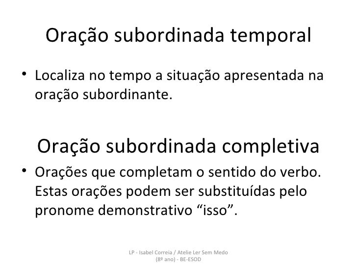 28. 28. Oração subordinada temporal <ul><li>Localiza no tempo a situação apresentada na oração subordinante. </li></ul><ul><li>Oração subordinada completiva </li></ul><ul><li>Orações que completam o sentido do verbo. Estas orações podem ser substituídas pelo pronome demonstrativo “isso”. </li></ul>LP - Isabel Correia / Atelie Ler Sem Medo (8º ano) - BE-ESOD