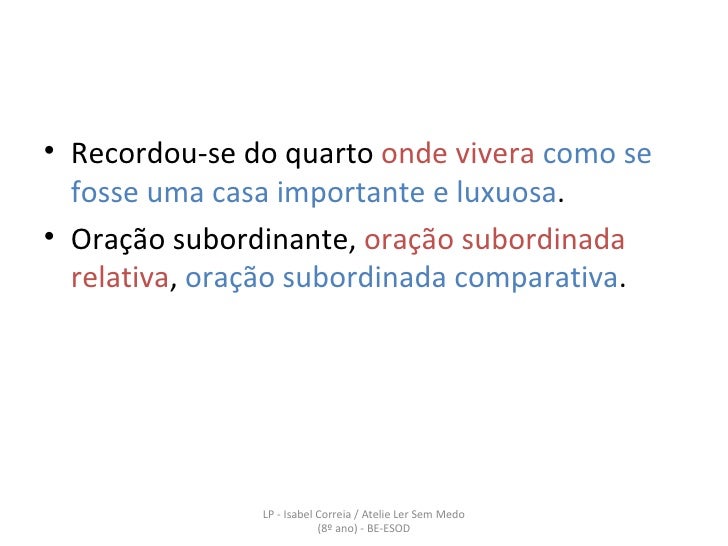 29. 29. <ul><li>Recordou-se do quarto onde vivera como se fosse uma casa importante e luxuosa . </li></ul><ul><li>Oração subordinante, oração subordinada relativa , oração subordinada comparativa . </li></ul>LP - Isabel Correia / Atelie Ler Sem Medo (8º ano) - BE-ESOD