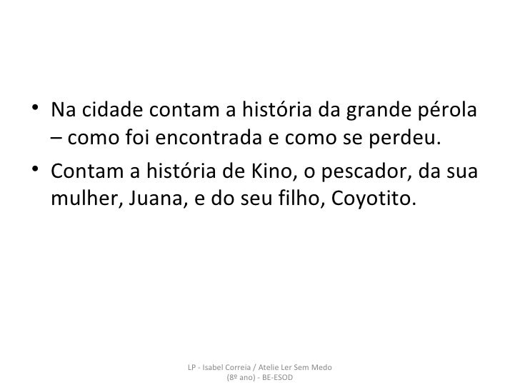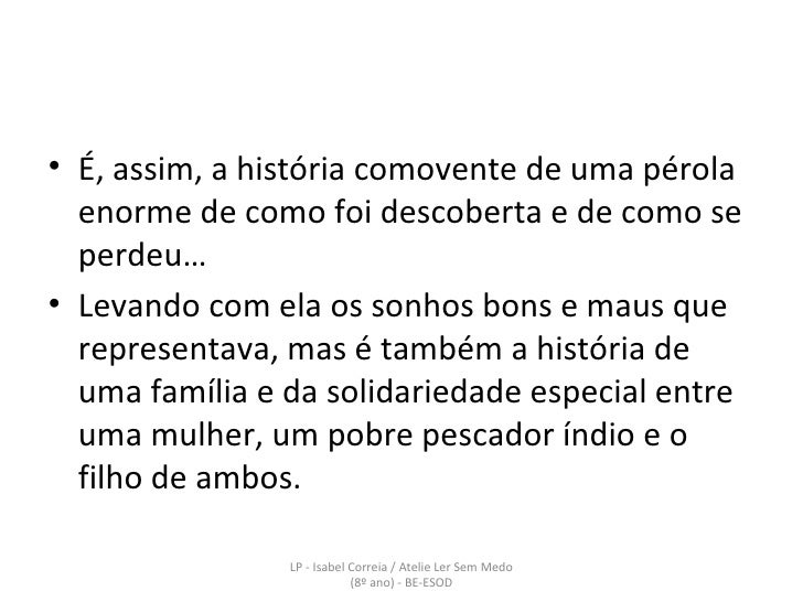 7. 7. <ul><li>É, assim, a história comovente de uma pérola enorme de como foi descoberta e de como se perdeu… </li></ul><ul><li>Levando com ela os sonhos bons e maus que representava, mas é também a história de uma família e da solidariedade especial entre uma mulher, um pobre pescador índio e o filho de ambos. </li></ul>LP - Isabel Correia / Atelie Ler Sem Medo (8º ano) - BE-ESOD