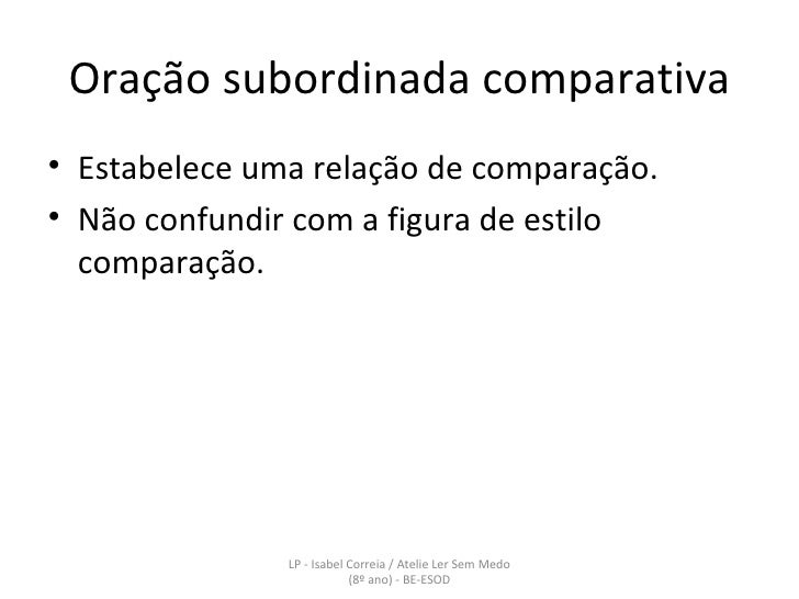 30. 30. Oração subordinada comparativa <ul><li>Estabelece uma relação de comparação. </li></ul><ul><li>Não confundir com a figura de estilo comparação. </li></ul>LP - Isabel Correia / Atelie Ler Sem Medo (8º ano) - BE-ESOD