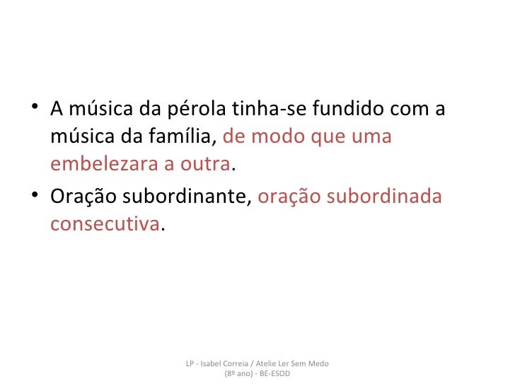 31. 31. <ul><li>A música da pérola tinha-se fundido com a música da família, de modo que uma embelezara a outra . </li></ul><ul><li>Oração subordinante, oração subordinada consecutiva . </li></ul>LP - Isabel Correia / Atelie Ler Sem Medo (8º ano) - BE-ESOD