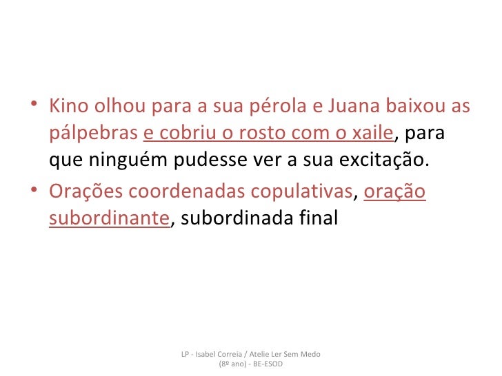 33. 33. <ul><li>Kino olhou para a sua pérola e Juana baixou as pálpebras e cobriu o rosto com o xaile , para que ninguém pudesse ver a sua excitação. </li></ul><ul><li>Orações coordenadas copulativas , oração subordinante , subordinada final </li></ul>LP - Isabel Correia / Atelie Ler Sem Medo (8º ano) - BE-ESOD