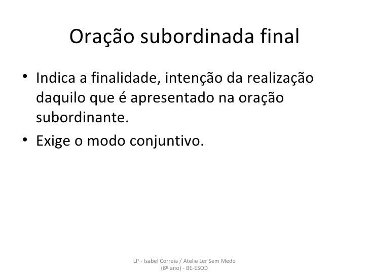 34. 34. Oração subordinada final <ul><li>Indica a finalidade, intenção da realização daquilo que é apresentado na oração subordinante. </li></ul><ul><li>Exige o modo conjuntivo. </li></ul>LP - Isabel Correia / Atelie Ler Sem Medo (8º ano) - BE-ESOD