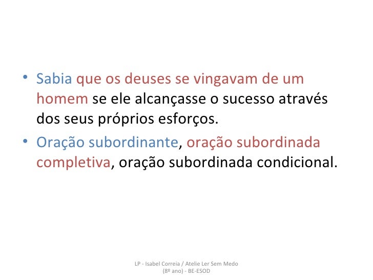 35. 35. <ul><li>Sabia que os deuses se vingavam de um homem se ele alcançasse o sucesso através dos seus próprios esforços. </li></ul><ul><li>Oração subordinante , oração subordinada completiva , oração subordinada condicional. </li></ul>LP - Isabel Correia / Atelie Ler Sem Medo (8º ano) - BE-ESOD