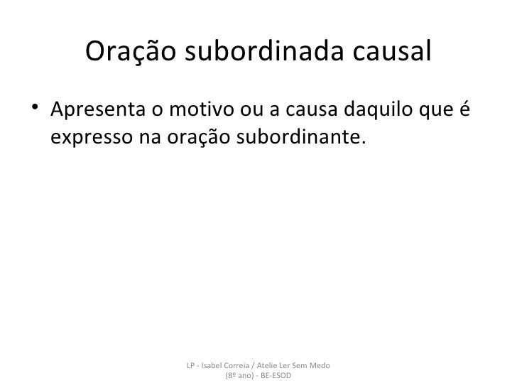 38. 38. Oração subordinada causal <ul><li>Apresenta o motivo ou a causa daquilo que é expresso na oração subordinante. </li></ul>LP - Isabel Correia / Atelie Ler Sem Medo (8º ano) - BE-ESOD