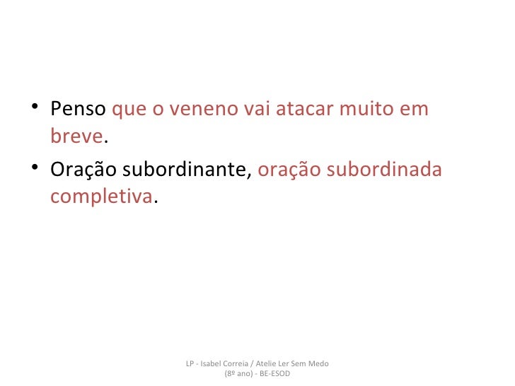 39. 39. <ul><li>Penso que o veneno vai atacar muito em breve . </li></ul><ul><li>Oração subordinante, oração subordinada completiva . </li></ul>LP - Isabel Correia / Atelie Ler Sem Medo (8º ano) - BE-ESOD