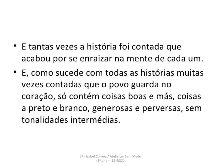 4. 4. <ul><li>E tantas vezes a história foi contada que acabou por se enraizar na mente de cada um. </li></ul><ul><li>E, como sucede com todas as histórias muitas vezes contadas que o povo guarda no coração, só contém coisas boas e más, coisas a preto e branco, generosas e perversas, sem tonalidades intermédias. </li></ul>LP - Isabel Correia / Atelie Ler Sem Medo (8º ano) - BE-ESOD