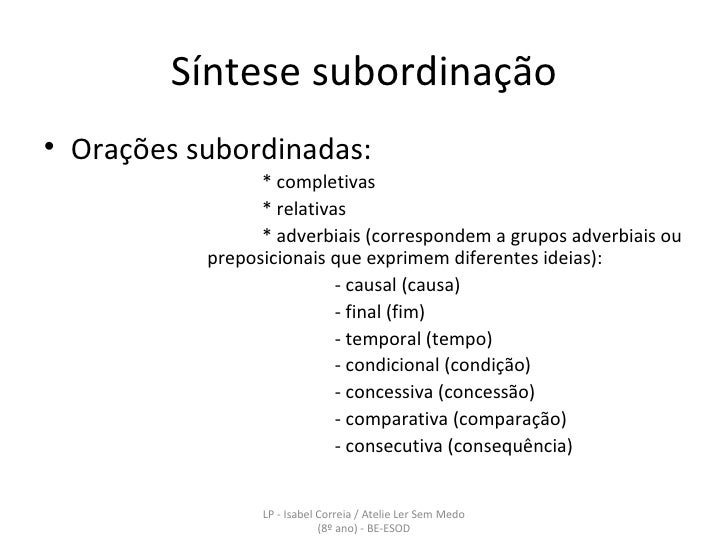 41. 41. Síntese subordinação <ul><li>Orações subordinadas: </li></ul><ul><ul><ul><ul><ul><li>* completivas </li></ul></ul></ul></ul></ul><ul><ul><ul><ul><ul><li>* relativas </li></ul></ul></ul></ul></ul><ul><ul><ul><ul><ul><li>* adverbiais (correspondem a grupos adverbiais ou preposicionais que exprimem diferentes ideias): </li></ul></ul></ul></ul></ul><ul><ul><ul><ul><ul><li>- causal (causa) </li></ul></ul></ul></ul></ul><ul><ul><ul><ul><ul><li>- final (fim) </li></ul></ul></ul></ul></ul><ul><ul><ul><ul><ul><li>- temporal (tempo) </li></ul></ul></ul></ul></ul><ul><ul><ul><ul><ul><li>- condicional (condição) </li></ul></ul></ul></ul></ul><ul><ul><ul><ul><ul><li>- concessiva (concessão) </li></ul></ul></ul></ul></ul><ul><ul><ul><ul><ul><li>- comparativa (comparação) </li></ul></ul></ul></ul></ul><ul><ul><ul><ul><ul><li>- consecutiva (consequência) </li></ul></ul></ul></ul></ul>LP - Isabel Correia / Atelie Ler Sem Medo (8º ano) - BE-ESOD