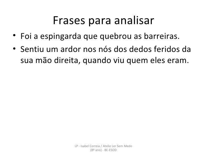 42. 42. Frases para analisar <ul><li>Foi a espingarda que quebrou as barreiras. </li></ul><ul><li>Sentiu um ardor nos nós dos dedos feridos da sua mão direita, quando viu quem eles eram. </li></ul>LP - Isabel Correia / Atelie Ler Sem Medo (8º ano) - BE-ESOD