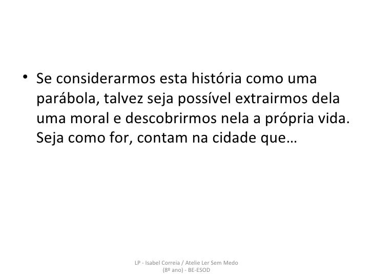 5. 5. <ul><li>Se considerarmos esta história como uma parábola, talvez seja possível extrairmos dela uma moral e descobrirmos nela a própria vida. Seja como for, contam na cidade que… </li></ul>LP - Isabel Correia / Atelie Ler Sem Medo (8º ano) - BE-ESOD