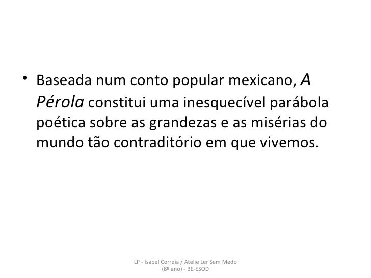 6. 6. <ul><li>Baseada num conto popular mexicano, A Pérola constitui uma inesquecível parábola poética sobre as grandezas e as misérias do mundo tão contraditório em que vivemos. </li></ul>LP - Isabel Correia / Atelie Ler Sem Medo (8º ano) - BE-ESOD