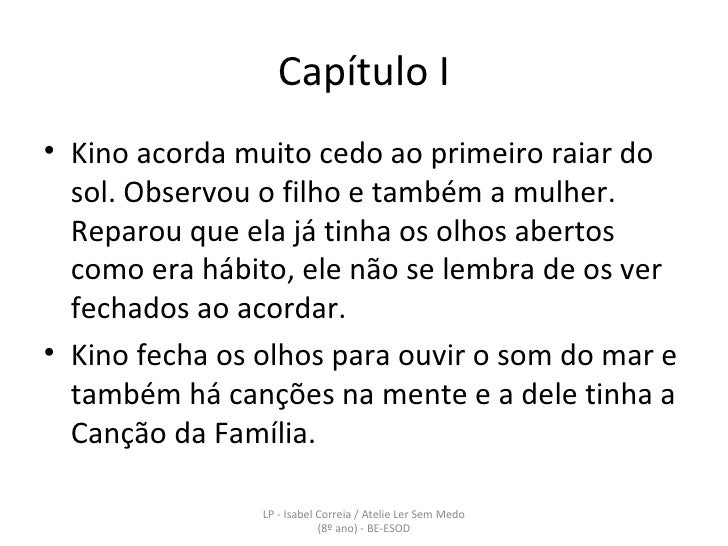 8. 8. Capítulo I <ul><li>Kino acorda muito cedo ao primeiro raiar do sol. Observou o filho e também a mulher. Reparou que ela já tinha os olhos abertos como era hábito, ele não se lembra de os ver fechados ao acordar. </li></ul><ul><li>Kino fecha os olhos para ouvir o som do mar e também há canções na mente e a dele tinha a Canção da Família. </li></ul>LP - Isabel Correia / Atelie Ler Sem Medo (8º ano) - BE-ESOD