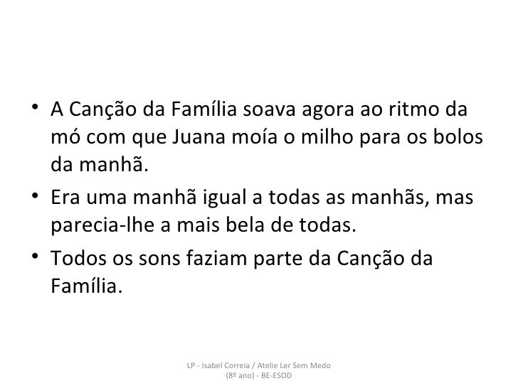 9. 9. <ul><li>A Canção da Família soava agora ao ritmo da mó com que Juana moía o milho para os bolos da manhã. </li></ul><ul><li>Era uma manhã igual a todas as manhãs, mas parecia-lhe a mais bela de todas. </li></ul><ul><li>Todos os sons faziam parte da Canção da Família. </li></ul>LP - Isabel Correia / Atelie Ler Sem Medo (8º ano) - BE-ESOD