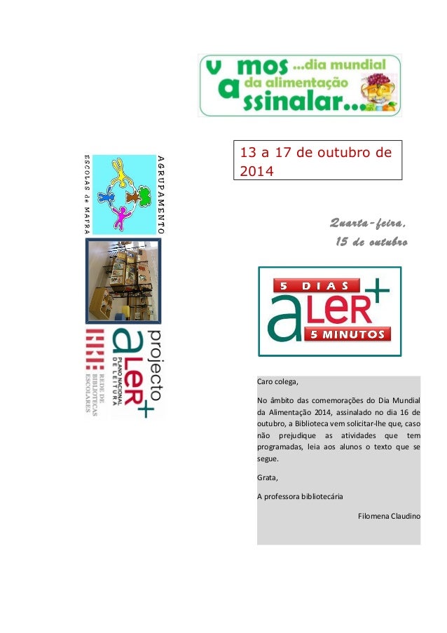 2. 2. 13 a 17 de outubro de 2014 Quarta-feira, 15 de outubro Caro colega, No âmbito das comemorações do Dia Mundial da Alimentação 2014, assinalado no dia 16 de outubro, a Biblioteca vem solicitar-lhe que, caso não prejudique as atividades que tem programadas, leia aos alunos o texto que se segue. Grata, A professora bibliotecária Filomena Claudino