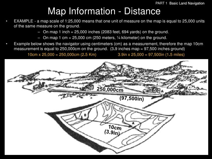 102. 102. PART 1 Basic Land Navigation Map Information - Distance• EXAMPLE - a map scale of 1:25,000 means that one unit of measure on the map is equal to 25,000 units of the same measure on the ground. – On map 1 inch = 25,000 inches (2083 feet, 694 yards) on the ground. – On map 1 cm = 25,000 cm (250 meters, ¼ kilometer) on the ground.• Example below shows the navigator using centimeters (cm) as a measurement, therefore the map 10cm measurement is equal to 250,000cm on the ground. (3.9 inches map = 97,500 inches ground) 10cm x 25,000 = 250,000cm (2.5 Km) 3.9in x 25,000 = 97,500in (1.5 miles)