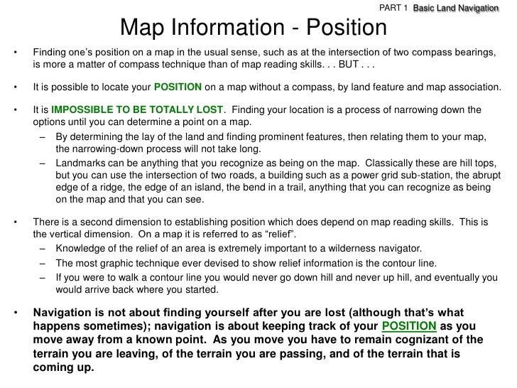 103. 103. PART 1 Basic Land Navigation Map Information - Position• Finding one’s position on a map in the usual sense, such as at the intersection of two compass bearings, is more a matter of compass technique than of map reading skills. . . BUT . . .• It is possible to locate your POSITION on a map without a compass, by land feature and map association.• It is IMPOSSIBLE TO BE TOTALLY LOST. Finding your location is a process of narrowing down the options until you can determine a point on a map. – By determining the lay of the land and finding prominent features, then relating them to your map, the narrowing-down process will not take long. – Landmarks can be anything that you recognize as being on the map. Classically these are hill tops, but you can use the intersection of two roads, a building such as a power grid sub-station, the abrupt edge of a ridge, the edge of an island, the bend in a trail, anything that you can recognize as being on the map and that you can see.• There is a second dimension to establishing position which does depend on map reading skills. This is the vertical dimension. On a map it is referred to as ―relief‖. – Knowledge of the relief of an area is extremely important to a wilderness navigator. – The most graphic technique ever devised to show relief information is the contour line. – If you were to walk a contour line you would never go down hill and never up hill, and eventually you would arrive back where you started.• Navigation is not about finding yourself after you are lost (although that’s what happens sometimes); navigation is about keeping track of your POSITION as you move away from a known point. As you move you have to remain cognizant of the terrain you are leaving, of the terrain you are passing, and of the terrain that is coming up.