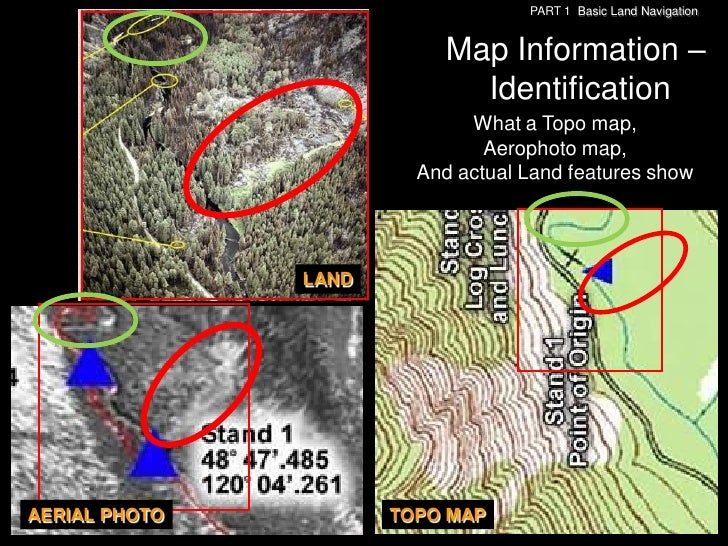 107. 107. PART 1 Basic Land Navigation Map Information – Identification What a Topo map, Aerophoto map, And actual Land features show LANDAERIAL PHOTO TOPO MAP