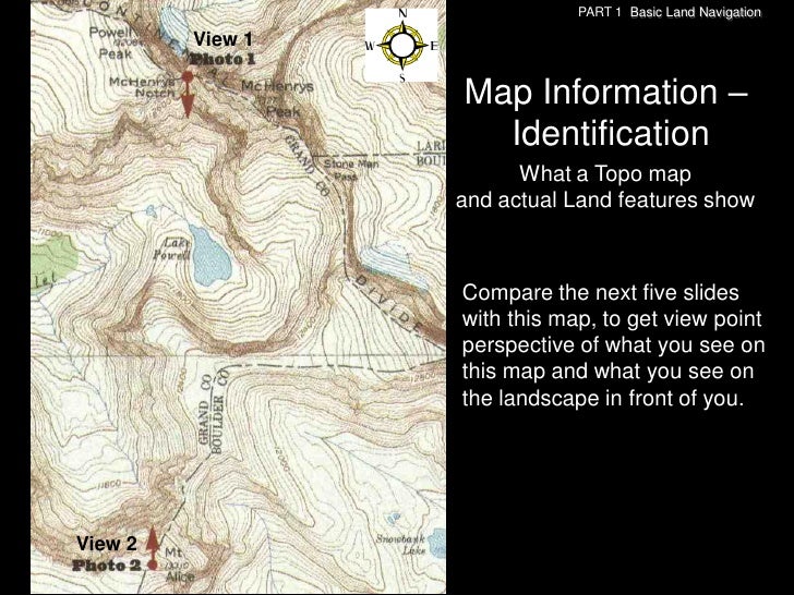 114. 114. PART 1 Basic Land Navigation Map Information – Identification What a Topo map and actual Land features show View 2View 2