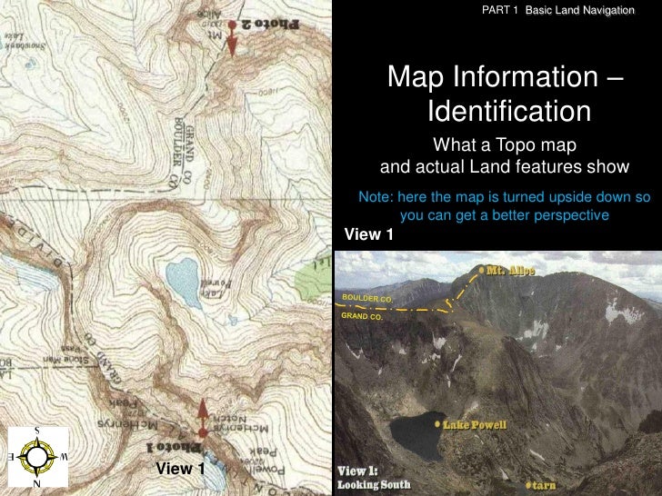113. 113. PART 1 Basic Land Navigation Map Information – Identification What a Topo map and actual Land features show Note: here the map is turned upside down so you can get a better perspective View 1View 1