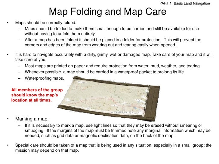 117. 117. PART 1 Basic Land Navigation Map Folding and Map Care• Maps should be correctly folded. – Maps should be folded to make them small enough to be carried and still be available for use without having to unfold them entirely. – After a map has been folded it should be placed in a folder for protection. This will prevent the corners and edges of the map from wearing out and tearing easily when opened.• It is hard to navigate accurately with a dirty, grimy, wet or damaged map. Take care of your map and it will take care of you. – Most maps are printed on paper and require protection from water, mud, weather, and tearing. – Whenever possible, a map should be carried in a waterproof packet to prolong its life. – Waterproofing maps. All members of the group should know the map’s location at all times.• Marking a map. – If it is necessary to mark a map, use light lines so that they may be erased without smearing or smudging. If the margins of the map must be trimmed note any marginal information which may be needed, such as grid data or magnetic declination data, on the back of the map.• Special care should be taken of a map that is being used in any situation, especially in a small group; the mission may depend on that map.