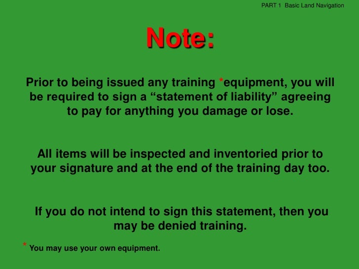5. 5. PART 1 Basic Land Navigation Note:Prior to being issued any training *equipment, you willbe required to sign a “statement of liability” agreeing to pay for anything you damage or lose. All items will be inspected and inventoried prior to your signature and at the end of the training day too. If you do not intend to sign this statement, then you may be denied training.* You may use your own equipment.
