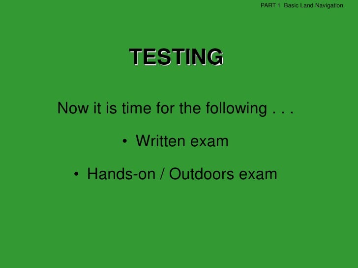 121. 121. PART 1 Basic Land Navigation TESTINGNow it is time for the following . . . • Written exam • Hands-on / Outdoors exam