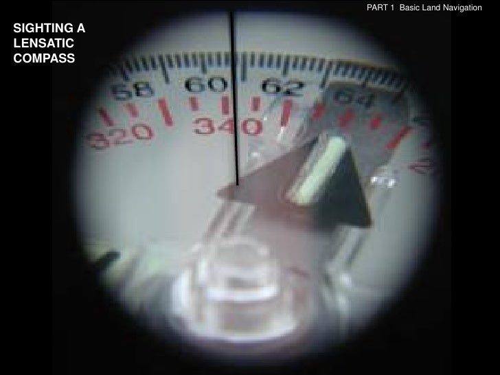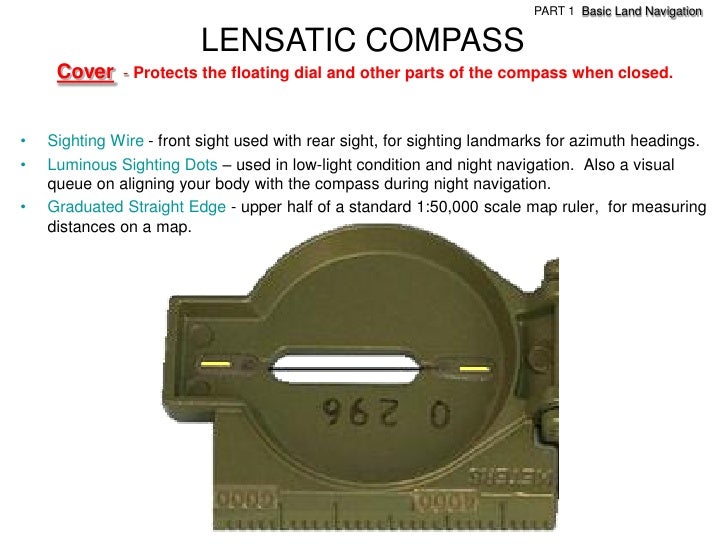 17. 17. PART 1 Basic Land Navigation LENSATIC COMPASS Cover - Protects the floating dial and other parts of the compass when closed.• Sighting Wire - front sight used with rear sight, for sighting landmarks for azimuth headings.• Luminous Sighting Dots – used in low-light condition and night navigation. Also a visual queue on aligning your body with the compass during night navigation.• Graduated Straight Edge - upper half of a standard 1:50,000 scale map ruler, for measuring distances on a map.