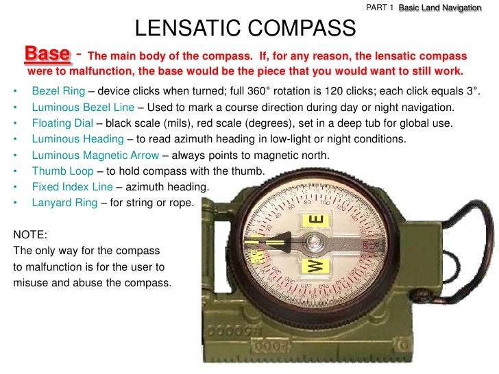 18. 18. PART 1 Basic Land Navigation LENSATIC COMPASS Base - The main body of the compass. If, for any reason, the lensatic compass were to malfunction, the base would be the piece that you would want to still work.• Bezel Ring – device clicks when turned; full 360° rotation is 120 clicks; each click equals 3°.• Luminous Bezel Line – Used to mark a course direction during day or night navigation.• Floating Dial – black scale (mils), red scale (degrees), set in a deep tub for global use.• Luminous Heading – to read azimuth heading in low-light or night conditions.• Luminous Magnetic Arrow – always points to magnetic north.• Thumb Loop – to hold compass with the thumb.• Fixed Index Line – azimuth heading.• Lanyard Ring – for string or rope.NOTE:The only way for the compassto malfunction is for the user tomisuse and abuse the compass.