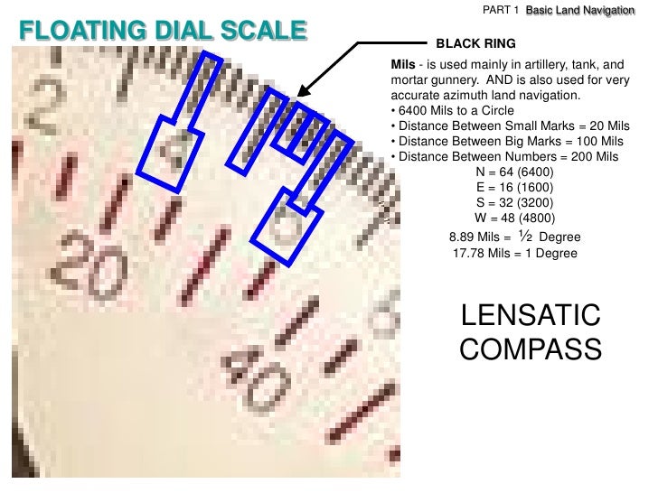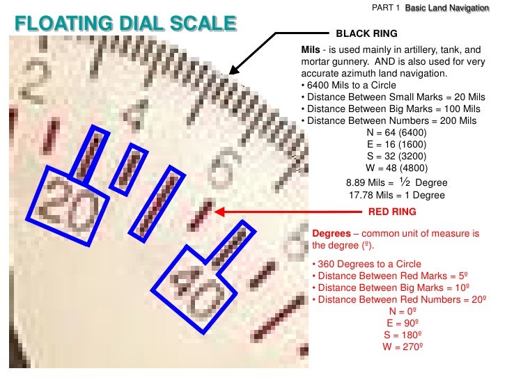 20. 20. PART 1 Basic Land NavigationFLOATING DIAL SCALE BLACK RING Mils - is used mainly in artillery, tank, and mortar gunnery. AND is also used for very accurate azimuth land navigation. • 6400 Mils to a Circle • Distance Between Small Marks = 20 Mils • Distance Between Big Marks = 100 Mils • Distance Between Numbers = 200 Mils N = 64 (6400) E = 16 (1600) S = 32 (3200) W = 48 (4800) 8.89 Mils = ½ Degree 17.78 Mils = 1 Degree RED RING Degrees – common unit of measure is the degree (º). • 360 Degrees to a Circle • Distance Between Red Marks = 5º • Distance Between Big Marks = 10º • Distance Between Red Numbers = 20º N = 0º E = 90º S = 180º W = 270º
