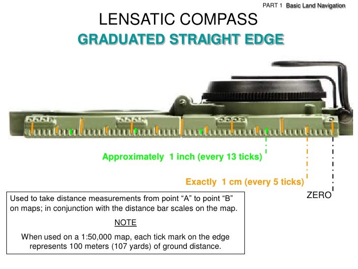 22. 22. PART 1 Basic Land Navigation LENSATIC COMPASS GRADUATED STRAIGHT EDGE Approximately 1 inch (every 13 ticks) Exactly 1 cm (every 5 ticks)Used to take distance measurements from point ―A‖ to point ―B‖ ZEROon maps; in conjunction with the distance bar scales on the map. NOTE When used on a 1:50,000 map, each tick mark on the edge represents 100 meters (107 yards) of ground distance.