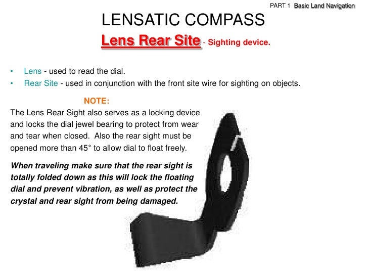 23. 23. PART 1 Basic Land Navigation LENSATIC COMPASS Lens Rear Site - Sighting device.• Lens - used to read the dial.• Rear Site - used in conjunction with the front site wire for sighting on objects. NOTE:The Lens Rear Sight also serves as a locking deviceand locks the dial jewel bearing to protect from wearand tear when closed. Also the rear sight must beopened more than 45° to allow dial to float freely.When traveling make sure that the rear sight istotally folded down as this will lock the floatingdial and prevent vibration, as well as protect thecrystal and rear sight from being damaged.