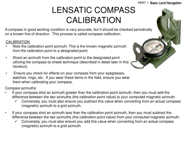 27. 27. PART 1 Basic Land Navigation LENSATIC COMPASS CALIBRATIONA compass in good working condition is very accurate, but it should be checked periodicallyon a known line of direction. This process is called compass calibration.CALIBRATION• Note the calibration point azimuth. This is the known magnetic azimuth from the calibration point to a designated point.• Shoot an azimuth from the calibration point to the designated point utilizing the compass-to-cheek technique (described in detail later in this handout).• Ensure you check for effects on your compass from your eyeglasses, watches, rings, etc. If you wear these items in the field, ensure you wear them when calibrating your compass.Compare azimuths:• If your compass shot an azimuth greater than the calibration point azimuth, then you must add the difference between the two azimuths (the calibration point value) to your computed magnetic azimuth.  Conversely, you must also ensure you subtract this value when converting from an actual compass (magnetic) azimuth to a grid azimuth.• If your compass shot an azimuth less than the calibration point azimuth, then you must subtract the difference between the two azimuths (the calibration point value) from your computed magnetic azimuth.  Conversely, you must also ensure you add this value when converting from an actual compass (magnetic) azimuth to a grid azimuth.