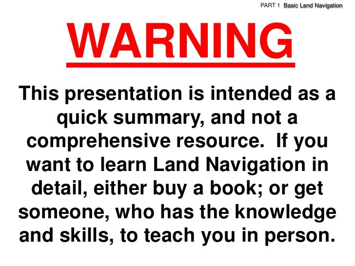 3. 3. PART 1 Basic Land Navigation WARNINGThis presentation is intended as a quick summary, and not a comprehensive resource. If you want to learn Land Navigation in detail, either buy a book; or getsomeone, who has the knowledgeand skills, to teach you in person.