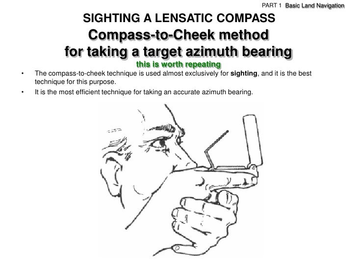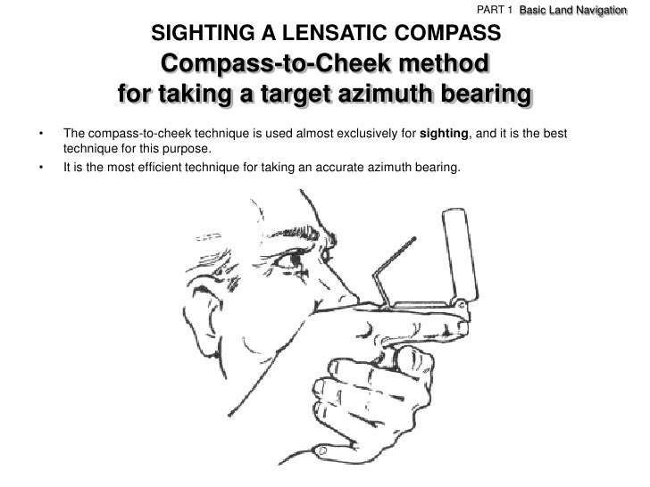 37. 37. PART 1 Basic Land Navigation SIGHTING A LENSATIC COMPASS Compass-to-Cheek method for taking a target azimuth bearing this is worth repeating• The compass-to-cheek technique is used almost exclusively for sighting, and it is the best technique for this purpose.• It is the most efficient technique for taking an accurate azimuth bearing.