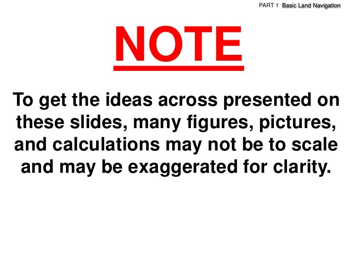 4. 4. PART 1 Basic Land Navigation NOTETo get the ideas across presented onthese slides, many figures, pictures,and calculations may not be to scale and may be exaggerated for clarity.