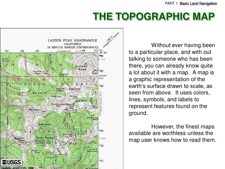 52. 52. PART 1 Basic Land NavigationTHE TOPOGRAPHIC MAP Without ever having been to a particular place, and with out talking to someone who has been there, you can already know quite a lot about it with a map. A map is a graphic representation of the earth’s surface drawn to scale, as seen from above. It uses colors, lines, symbols, and labels to represent features found on the ground. However, the finest maps available are worthless unless the map user knows how to read them.