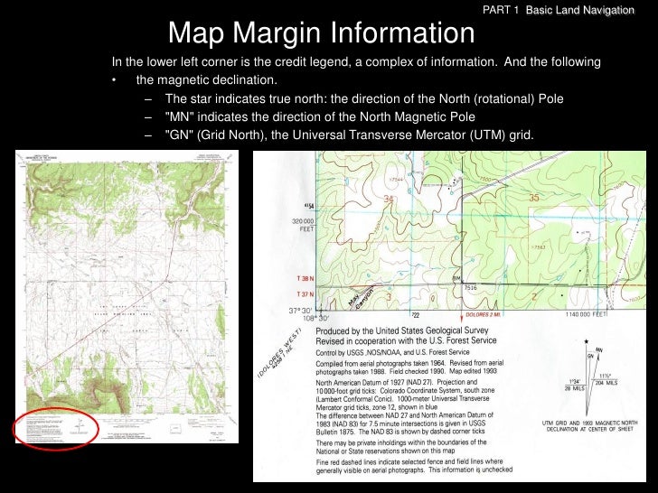 59. 59. PART 1 Basic Land Navigation Map Margin InformationIn the lower left corner is the credit legend, a complex of information. And the following• the magnetic declination. – The star indicates true north: the direction of the North (rotational) Pole – "MN" indicates the direction of the North Magnetic Pole – "GN" (Grid North), the Universal Transverse Mercator (UTM) grid.