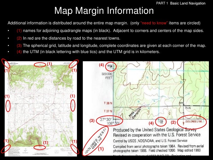 60. 60. PART 1 Basic Land Navigation Map Margin Information Additional information is distributed around the entire map margin. (only ―need to know‖ items are circled) • (1) names for adjoining quadrangle maps (in black). Adjacent to corners and centers of the map sides. • (2) In red are the distances by road to the nearest towns. • (3) The spherical grid, latitude and longitude, complete coordinates are given at each corner of the map. • (4) the UTM (in black lettering with blue tics) and the UTM grid is in kilometers. (1) (4)(1) (1)(1) (1) (3) (2) (4)(1) (1) (1) (1)