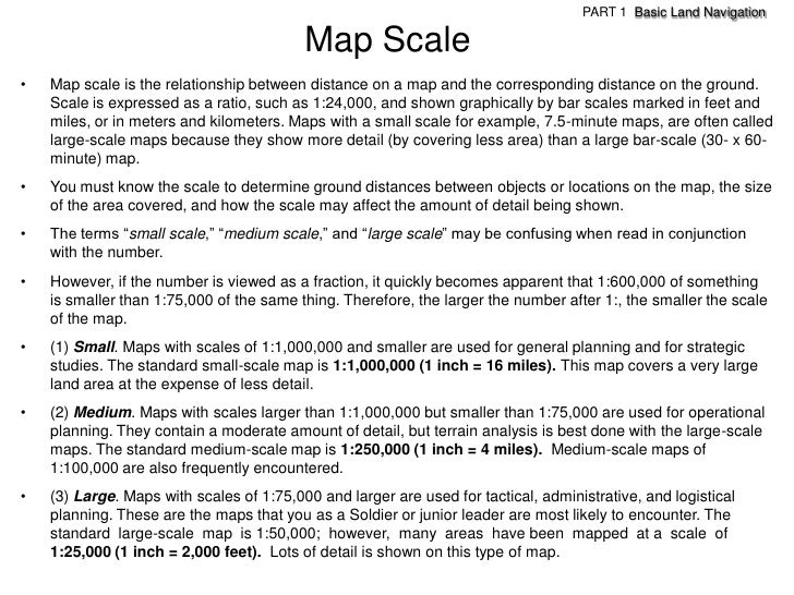 62. 62. PART 1 Basic Land Navigation Map Scale• Map scale is the relationship between distance on a map and the corresponding distance on the ground. Scale is expressed as a ratio, such as 1:24,000, and shown graphically by bar scales marked in feet and miles, or in meters and kilometers. Maps with a small scale for example, 7.5-minute maps, are often called large-scale maps because they show more detail (by covering less area) than a large bar-scale (30- x 60- minute) map.• You must know the scale to determine ground distances between objects or locations on the map, the size of the area covered, and how the scale may affect the amount of detail being shown.• The terms ―small scale,‖ ―medium scale,‖ and ―large scale‖ may be confusing when read in conjunction with the number.• However, if the number is viewed as a fraction, it quickly becomes apparent that 1:600,000 of something is smaller than 1:75,000 of the same thing. Therefore, the larger the number after 1:, the smaller the scale of the map.• (1) Small. Maps with scales of 1:1,000,000 and smaller are used for general planning and for strategic studies. The standard small-scale map is 1:1,000,000 (1 inch = 16 miles). This map covers a very large land area at the expense of less detail.• (2) Medium. Maps with scales larger than 1:1,000,000 but smaller than 1:75,000 are used for operational planning. They contain a moderate amount of detail, but terrain analysis is best done with the large-scale maps. The standard medium-scale map is 1:250,000 (1 inch = 4 miles). Medium-scale maps of 1:100,000 are also frequently encountered.• (3) Large. Maps with scales of 1:75,000 and larger are used for tactical, administrative, and logistical planning. These are the maps that you as a Soldier or junior leader are most likely to encounter. The standard large-scale map is 1:50,000; however, many areas have been mapped at a scale of 1:25,000 (1 inch = 2,000 feet). Lots of detail is shown on this type of map.