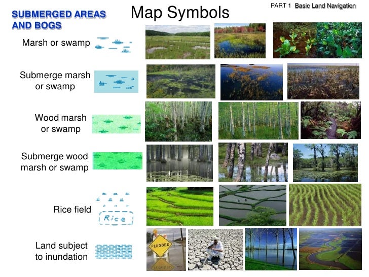 68. 68. PART 1 Basic Land NavigationSUBMERGED AREAS Map SymbolsAND BOGS Marsh or swamp Submerge marsh or swamp Wood marsh or swamp Submerge wood marsh or swamp Rice field Land subject to inundation