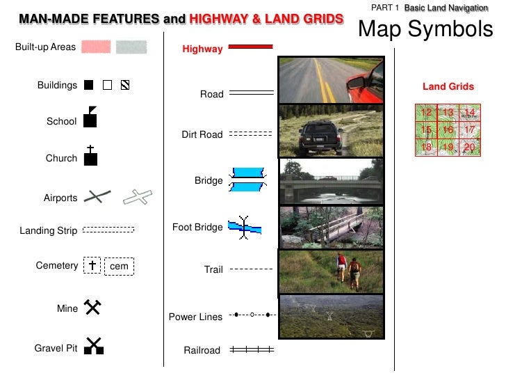 70. 70. PART 1 Basic Land NavigationMAN-MADE FEATURES and HIGHWAY & LAND GRIDS Map SymbolsBuilt-up Areas Highway Buildings Land Grids Road 12 13 14 School Dirt Road 15 16 17 18 19 20 Church Bridge Airports Landing Strip Foot Bridge Cemetery cem Trail Mine Power Lines Gravel Pit Railroad