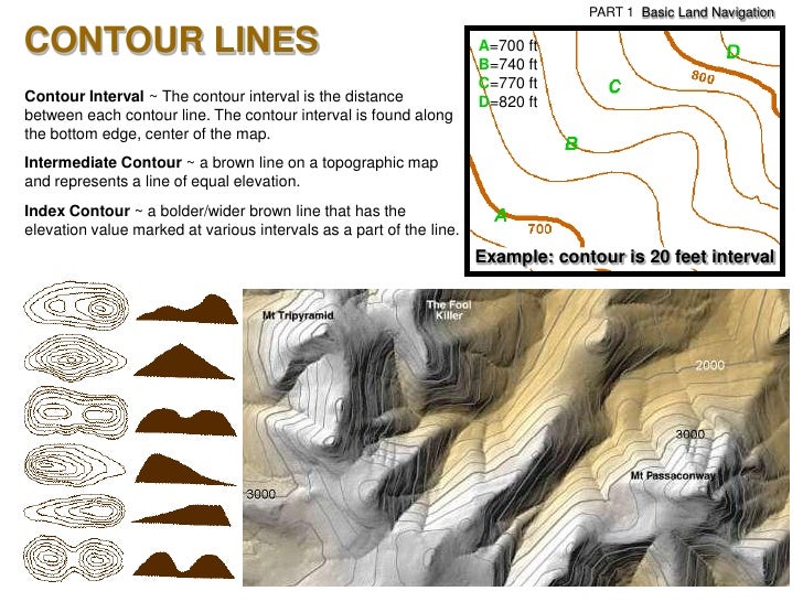 72. 72. PART 1 Basic Land NavigationCONTOUR LINES A=700 ft B=740 ft C=770 ftContour Interval ~ The contour interval is the distance D=820 ftbetween each contour line. The contour interval is found alongthe bottom edge, center of the map.Intermediate Contour ~ a brown line on a topographic mapand represents a line of equal elevation.Index Contour ~ a bolder/wider brown line that has theelevation value marked at various intervals as a part of the line. Example: contour is 20 feet interval